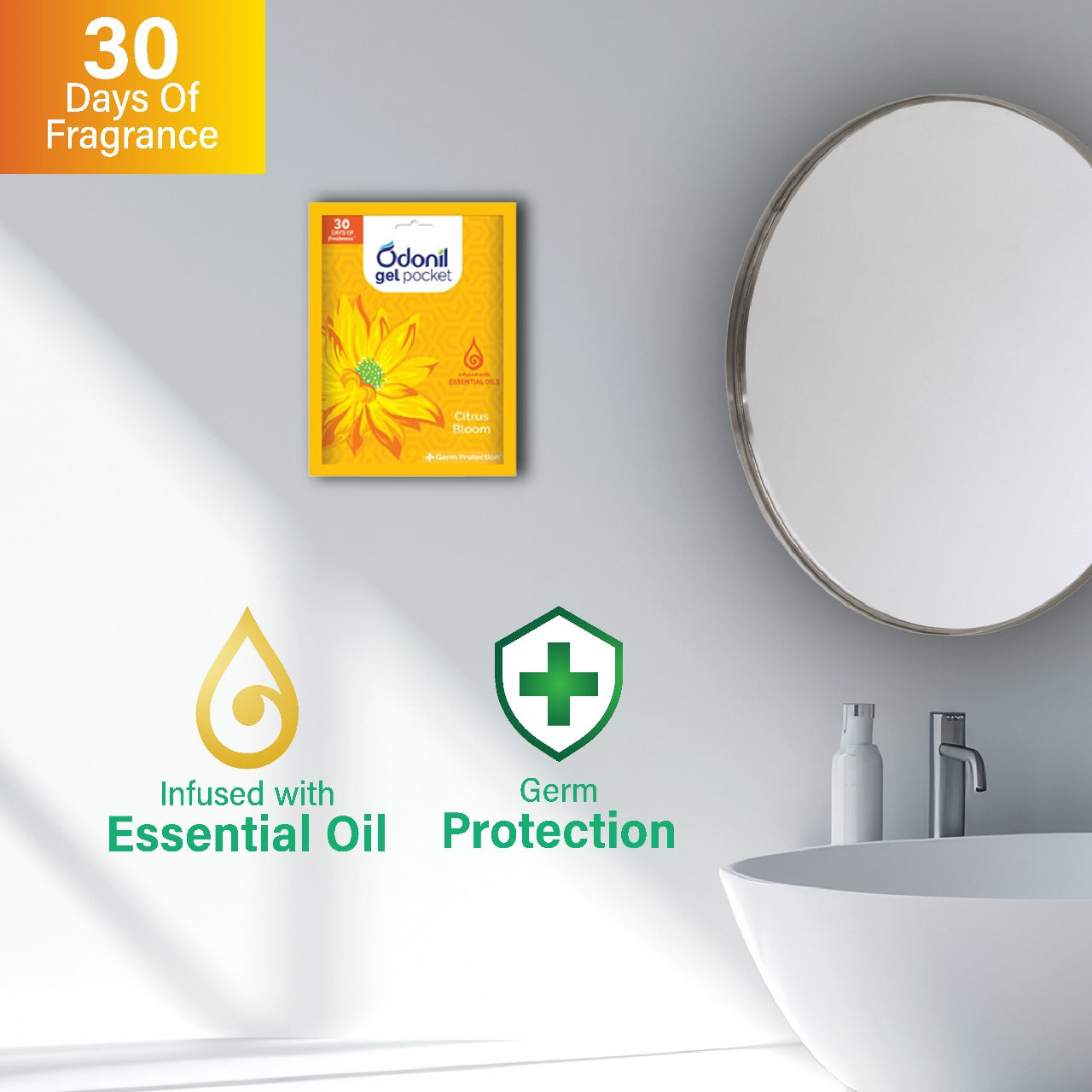 Infused with essential oils and germ protection, Odonil Gel Pocket Citrus Bloom brings